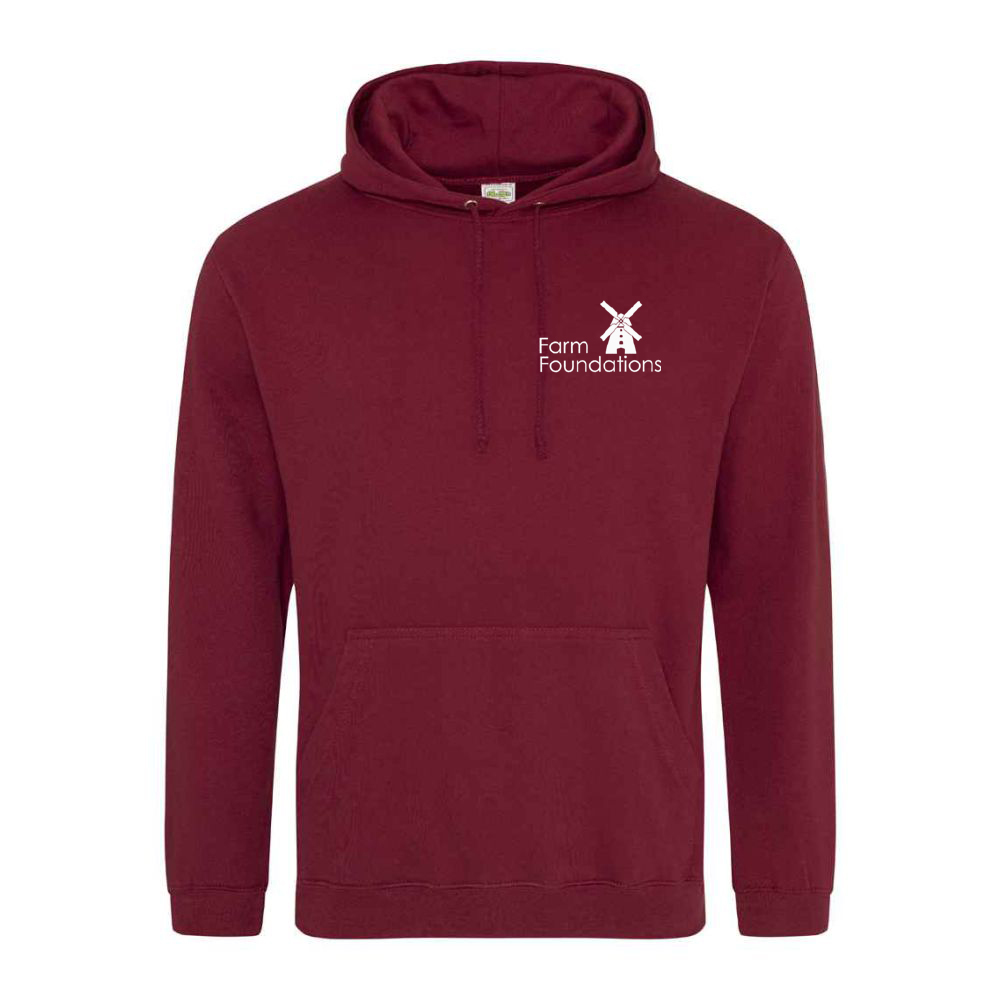 80% Ringspun cotton, 20% Polyester. Front pouch pocket. double fabric hood with drawcord. Embroidered on the front and printed on the back with Farm Foundations logo.