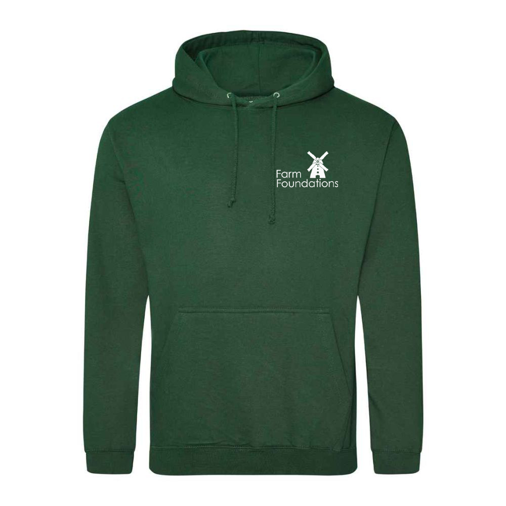 80% Ringspun cotton, 20% Polyester. Front pouch pocket. double fabric hood with drawcord (no cord on children’s sizes). Embroidered on the front and printed on the back with Farm Foundations logo.