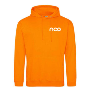 80% ringspun cotton/ 20% polyester. Ribbed cuffs and hem with front pouch pocket and drawcord (no drawcord on children’s sizes). Embroidered on the left chest with NCO logo. Printed on the back for 2026. All decoration in white.