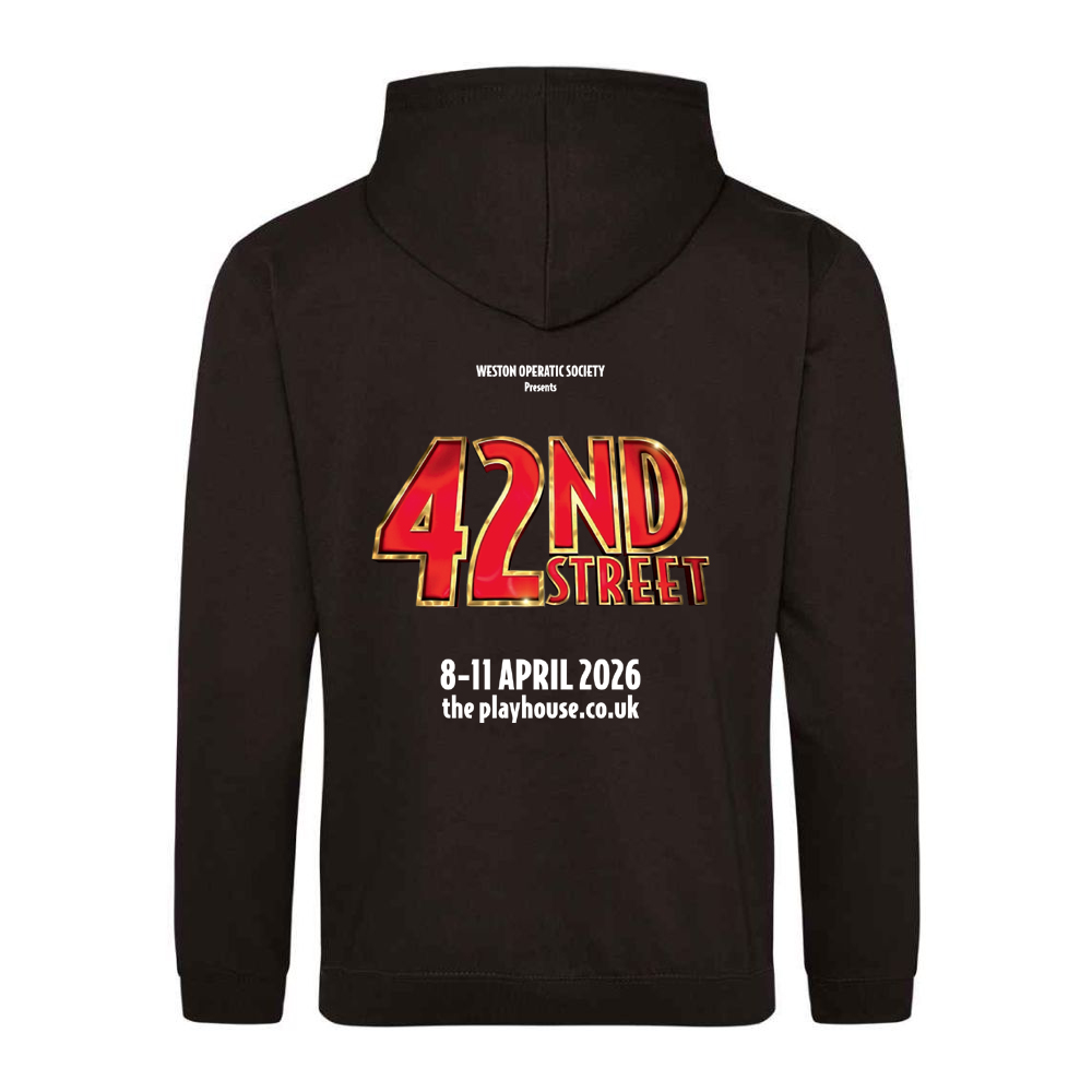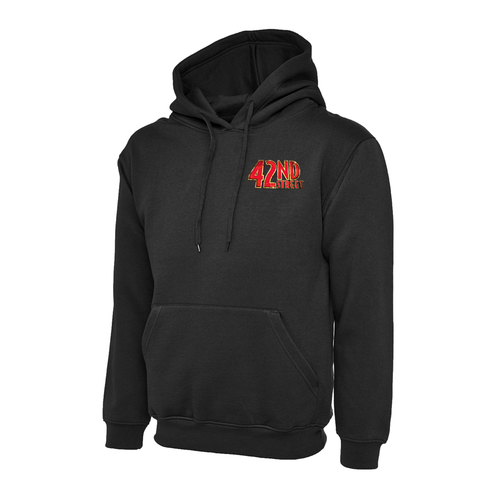 50% polyester, 50% cotton. Front pouch pockets. Double fabric hood with drawcord. Printed left chest and back for the 42nd Street show.