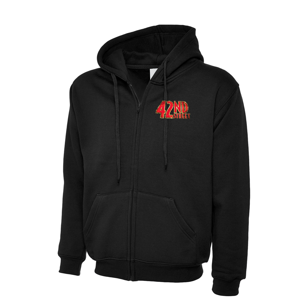 50% polyester, 50% cotton. Full Zip with two side pockets. Double fabric hood with drawcord. Printed left chest and back for the 42nd Street show.